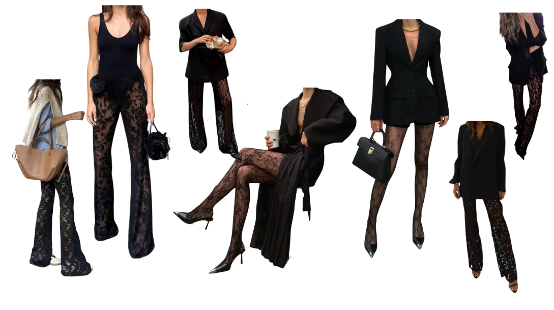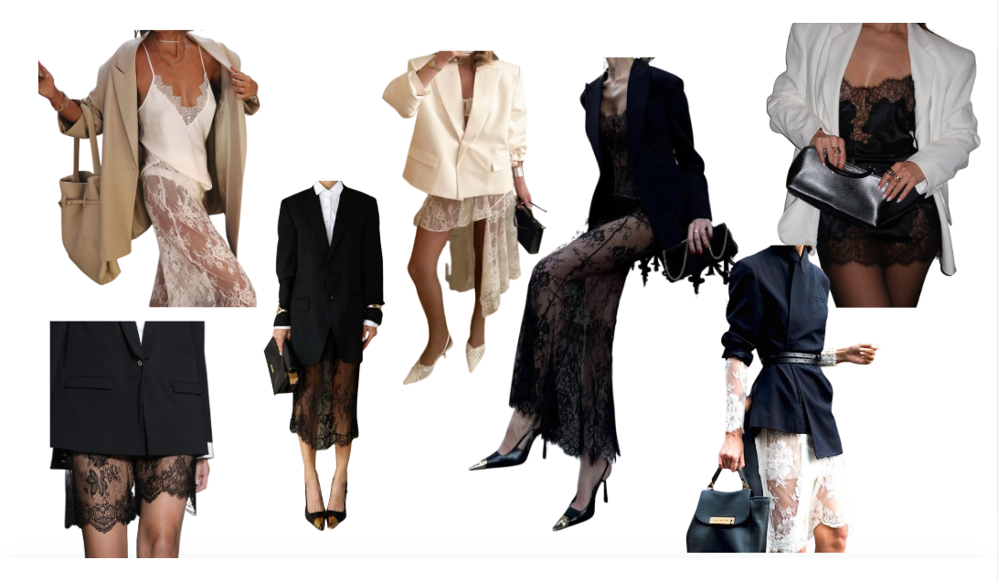 • Structure first, romance second. Build the outfit from a clean base (blazer, straight trouser, crisp shirt); add lace as an accent.
