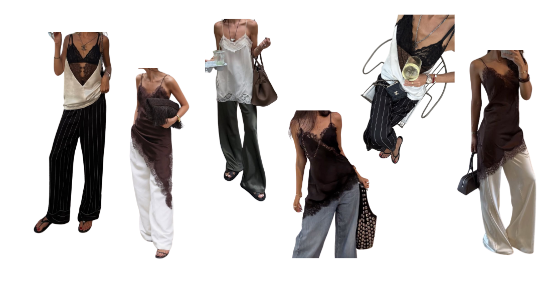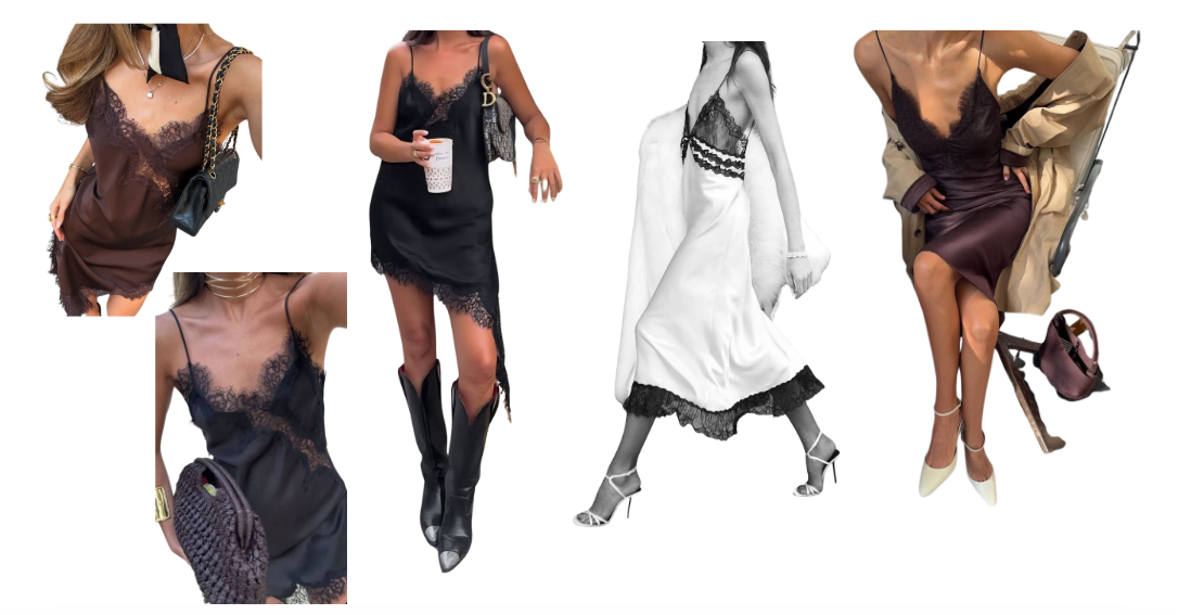 • Shiny satin + heavy lace in daylight. Swap to matte crepe, wool, denim, or leather so lace-trim reads polished, not lingerie.