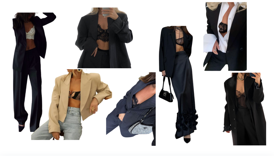 How to wear: lace bralette under a black/navy suit or a white shirt half-buttoned, blazer on top.