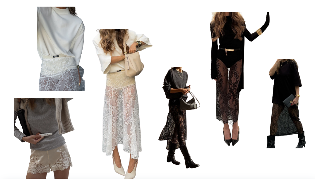 • Too much lace (breaks the 10% rule). If lace dominates the look, add a blazer/coat and matte textures to balance.
